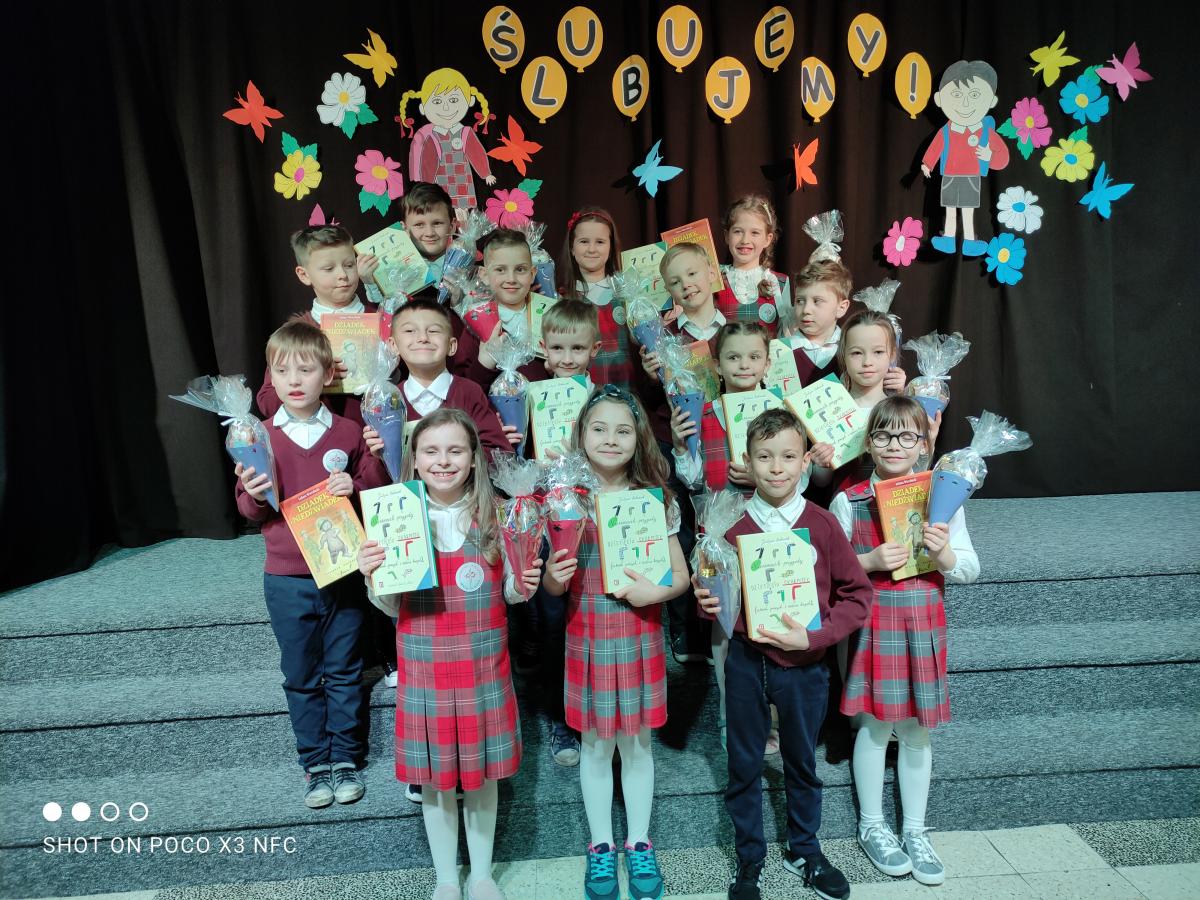 6 maja 2021 roku odbyła się w naszej szkole uroczystość pasowania na ucznia. Była długo wyczekiwanym dniem i odbyła się bez udziału rodziców oraz koleżanek i kolegów ze względu na pandemię. W tym dniu dzieci zostały oficjalnie przyjęte do grona uczniów. Pierwszoklasiści doskonale zaprezentowali przygotowany program artystyczny - recytowali wiersze, śpiewali piosenki i tańczyli. Jednak najważniejszą częścią uroczystości było pasowanie wielkim piórem przez Panią Dyrektor, podczas którego uczniowie przyrzekali być wzorowymi uczniami i godnymi Polakami. Na zakończenie dzieci otrzymały upominki i szkolne legitymacje.